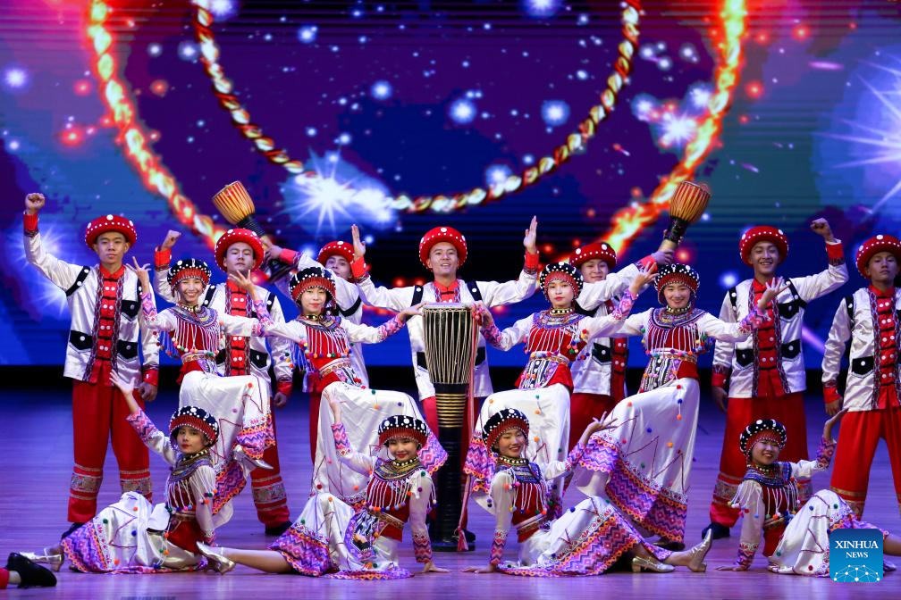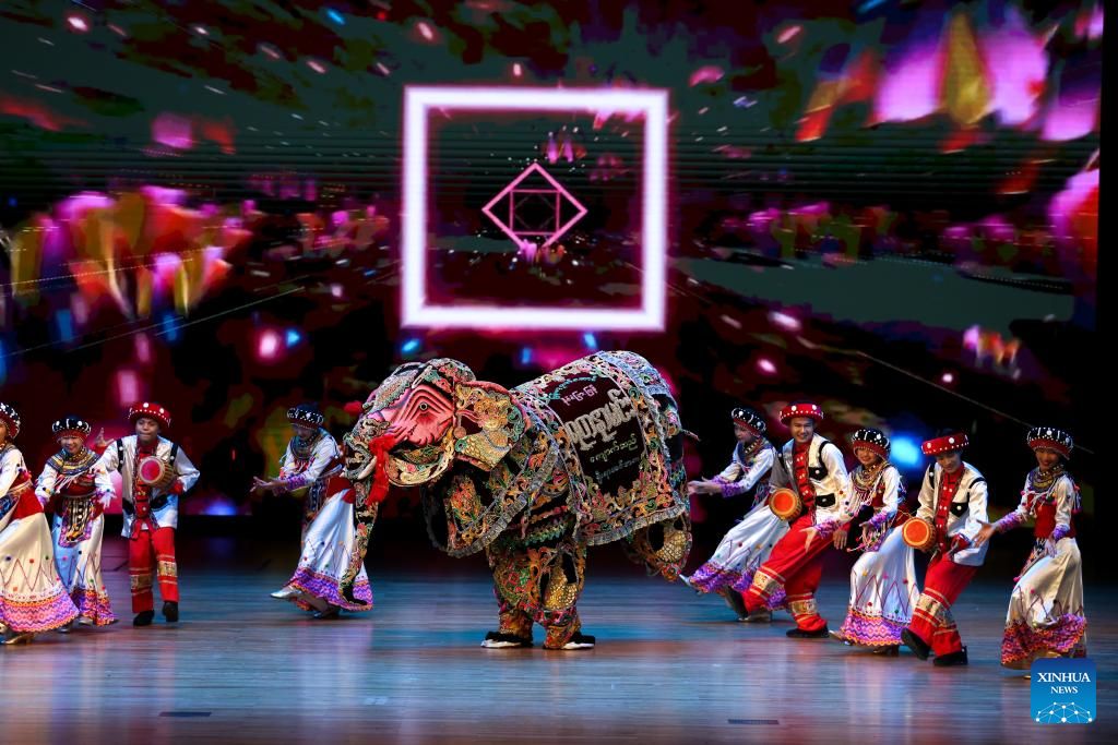 Artists perform during the grand finals and award ceremony of Myanmar's Chinese song competition at the National Theater in Yangon, Myanmar, Oct. 26, 2025. (Xinhua/Myo Kyaw Soe)