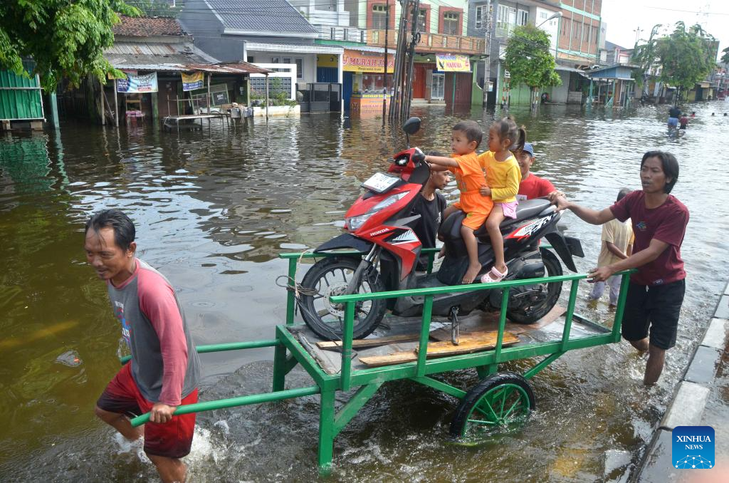 People transport a motorbike by a cart through flood water after heavy rain in Semarang, Central Java, Indonesia, Oct. 30, 2025. (Photo by Kalila/Xinhua)