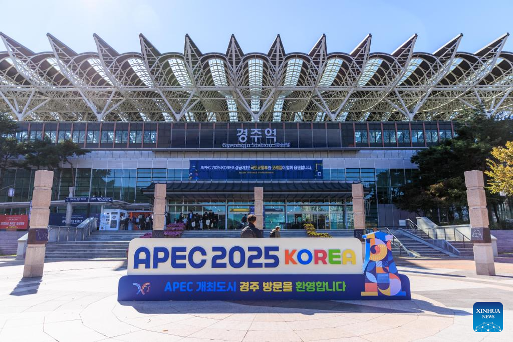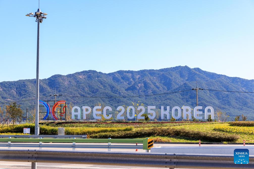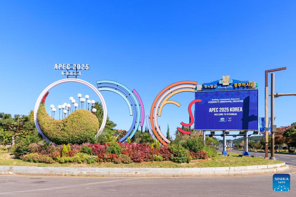 This photo taken on Oct. 28, 2025 shows a publicity installation of the 32nd Asia-Pacific Economic Cooperation (APEC) Economic Leaders' Meeting in Gyeongju, South Korea. The first session of the 32nd APEC Economic Leaders' Meeting was held in Gyeongju on Friday. (Photo by Park Jintaek/Xinhua)