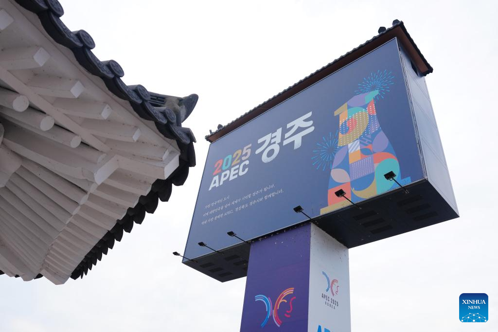 This photo taken on Oct. 31, 2025 shows a publicity board of the 32nd Asia-Pacific Economic Cooperation (APEC) Economic Leaders' Meeting in Gyeongju, South Korea, Oct. 31, 2025. The first session of the 32nd APEC Economic Leaders' Meeting was held in Gyeongju on Friday. (Xinhua/Jia Haocheng)
