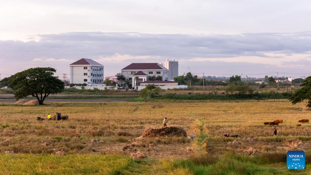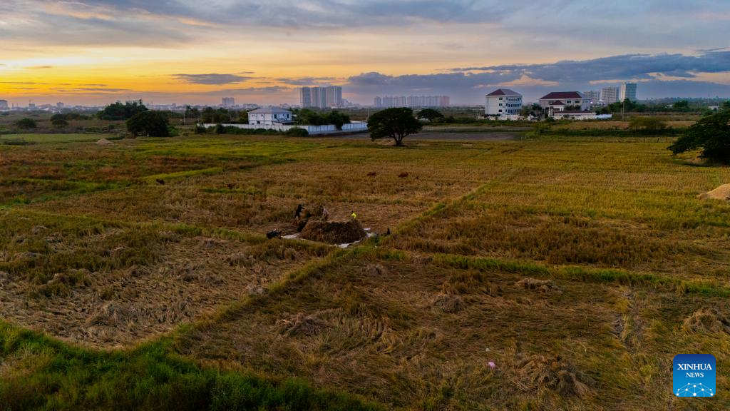 An aerial drone photo taken on Nov. 2, 2025 shows farmers harvesting rice in a rice field in Vientiane, Laos. Local farmers have recently been busy harvesting the rice as the harvest season comes. (Photo by Kaikeo Saiyasane/Xinhua)