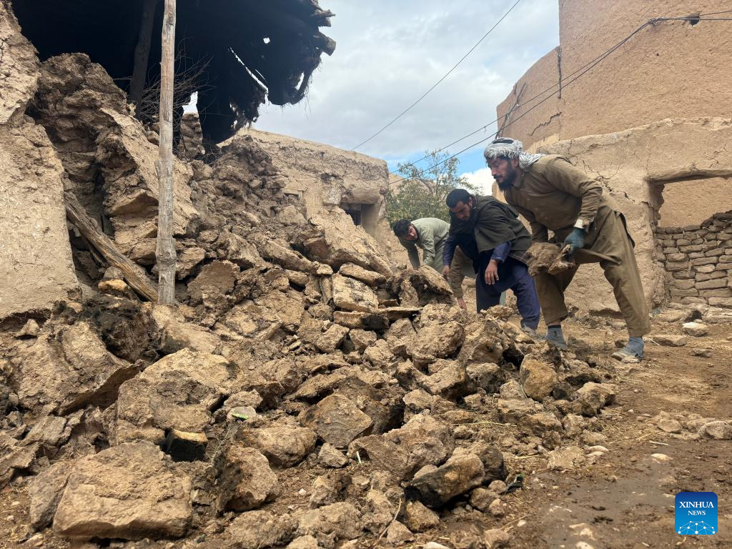 People clear the debris of the collapsed houses in Khulm area, Afghanistan, Nov. 4, 2025. An earthquake in northern Afghanistan has left 24 people dead and more than 630 injured, most of them with minor injuries, Afghanistan's National Disaster Management Authority said on Monday.