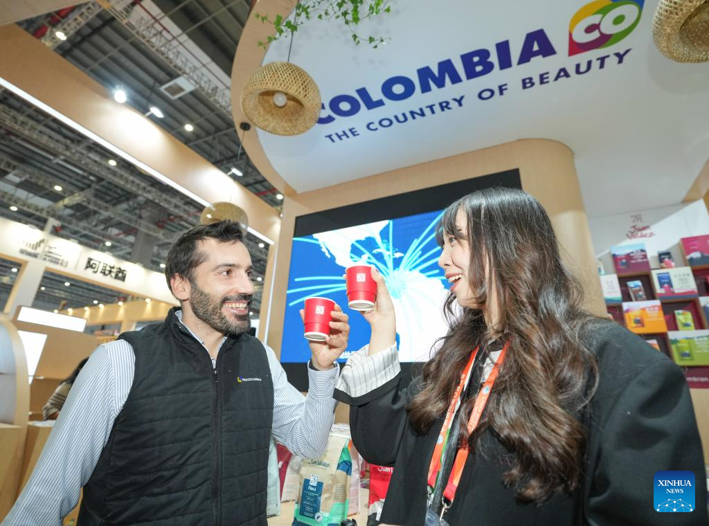 People taste coffee at the Colombia Pavilion during the eighth China International Import Expo (CIIE) in east China's Shanghai, Nov. 5, 2025. The eighth CIIE opened here on Wednesday. Thailand, the United Arab Emirates, Nigeria, Georgia, Sweden and Colombia serve as the guest countries of honor at this year's CIIE. (Xinhua/Fan Yuqing)