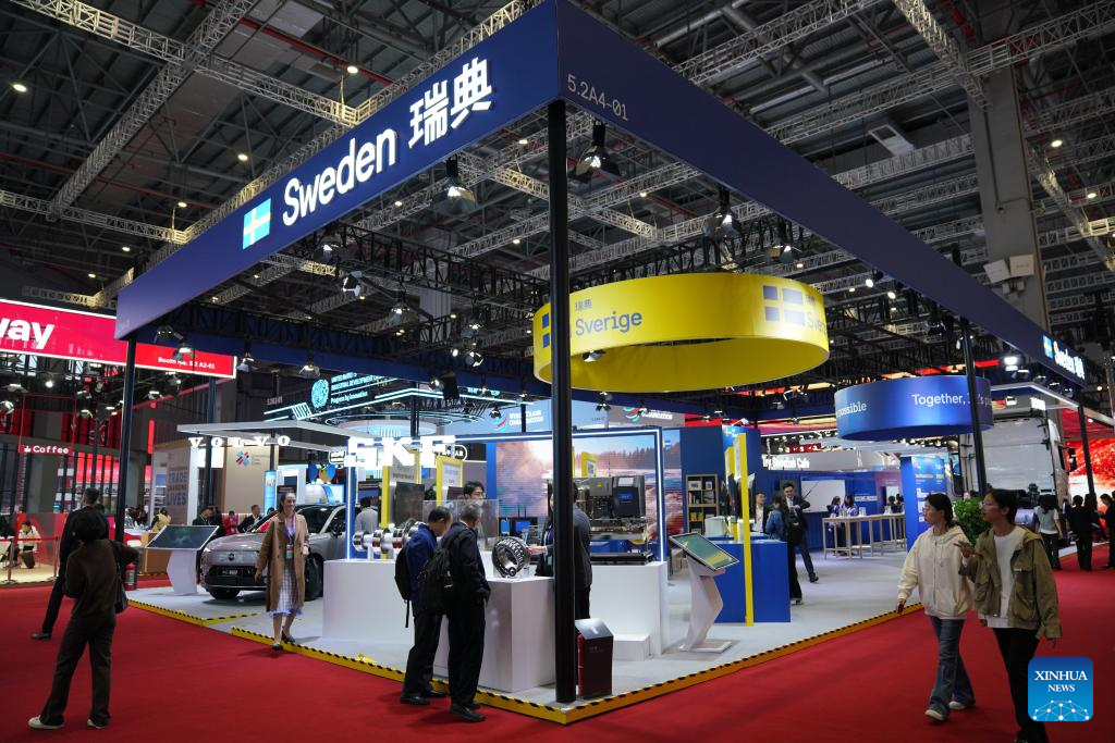 This photo shows the Sweden Pavilion during the eighth China International Import Expo (CIIE) in east China's Shanghai, Nov. 5, 2025. The eighth CIIE opened here on Wednesday. Thailand, the United Arab Emirates, Nigeria, Georgia, Sweden and Colombia serve as the guest countries of honor at this year's CIIE. (Xinhua/Fan Yuqing)