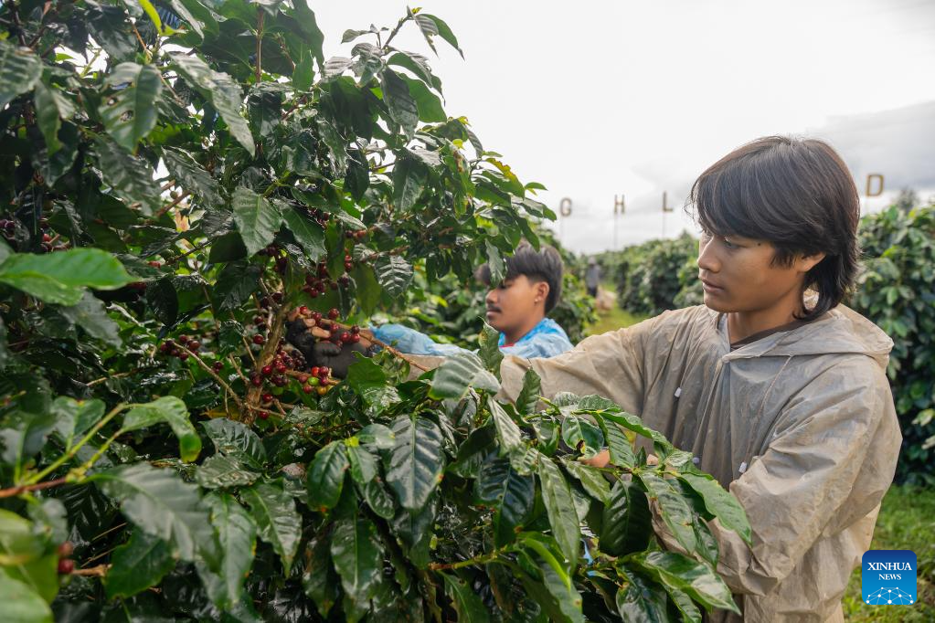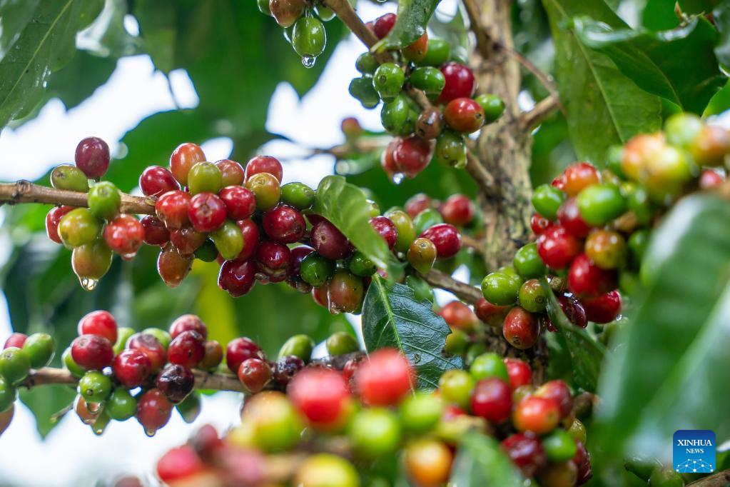 This photo taken on Nov. 9, 2025 shows coffee beans at a coffee plantation in Champasak Province, Laos. Champasak Province is the main coffee-producing area of Laos. Boasting suitable climatic conditions and fertile volcanic soil, the area provides exceptional advantages for the growth of coffee trees. (Photo by Kaikeo Saiyasane/Xinhua)