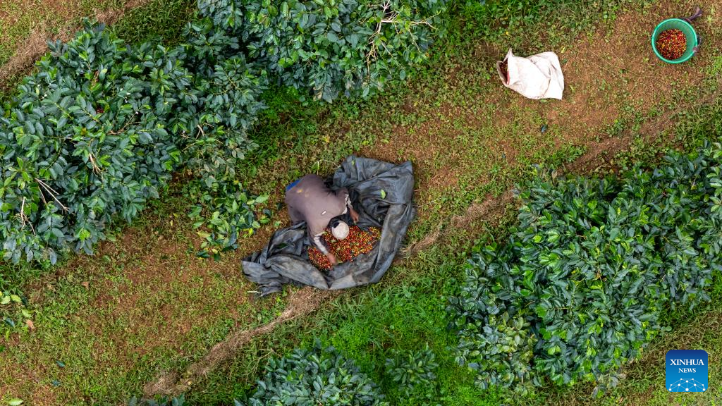 This drone photo taken on Nov. 9, 2025 shows a farmer picking up coffee beans at a coffee plantation in Champasak Province, Laos. Champasak Province is the main coffee-producing area of Laos. Boasting suitable climatic conditions and fertile volcanic soil, the area provides exceptional advantages for the growth of coffee trees. (Photo by Kaikeo Saiyasane/Xinhua)