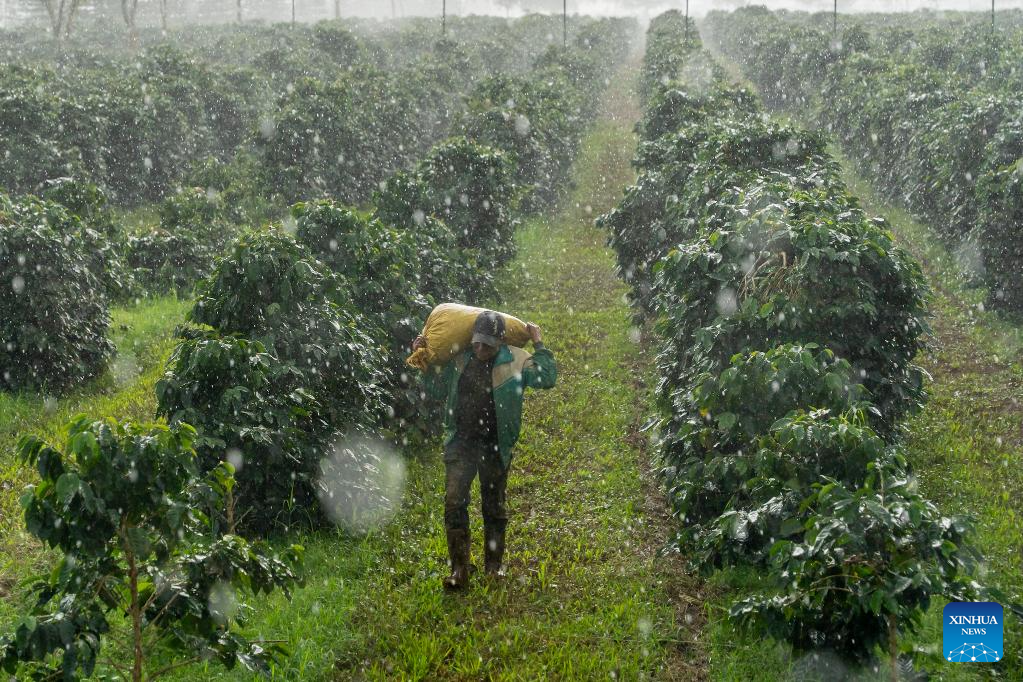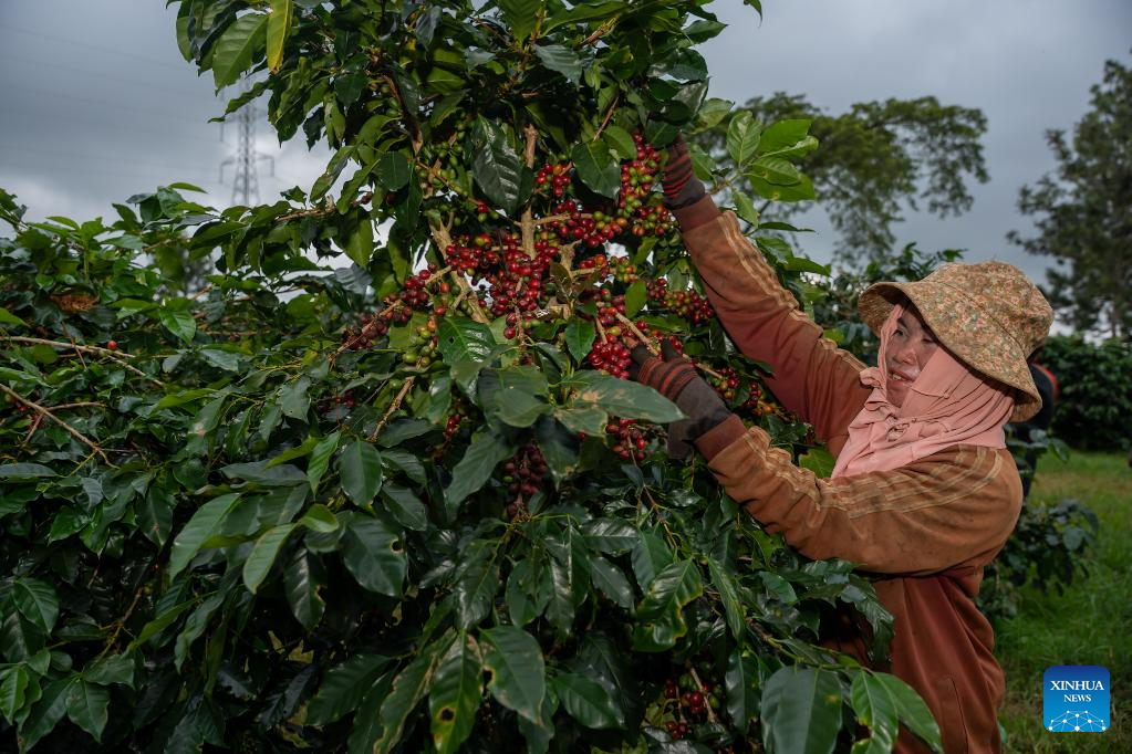 A farmer picks up coffee beans at a coffee plantation in Champasak Province, Laos, Nov. 9, 2025. Champasak Province is the main coffee-producing area of Laos. Boasting suitable climatic conditions and fertile volcanic soil, the area provides exceptional advantages for the growth of coffee trees. (Photo by Kaikeo Saiyasane/Xinhua)