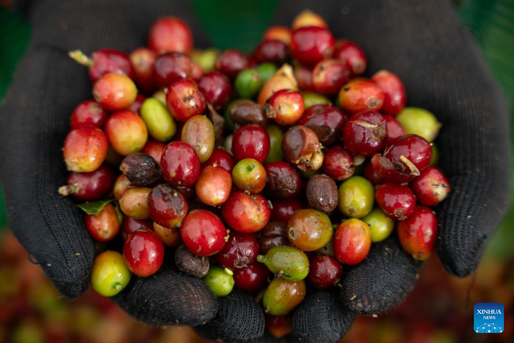 A farmer demonstrates newly-picked coffee beans at a coffee plantation in Champasak Province, Laos, Nov. 9, 2025. Champasak Province is the main coffee-producing area of Laos. Boasting suitable climatic conditions and fertile volcanic soil, the area provides exceptional advantages for the growth of coffee trees. (Photo by Kaikeo Saiyasane/Xinhua)