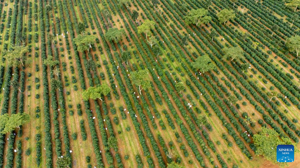 This aerial drone photo taken on Nov. 9, 2025 shows a coffee plantation in Champasak Province, Laos. Champasak Province is the main coffee-producing area of Laos. Boasting suitable climatic conditions and fertile volcanic soil, the area provides exceptional advantages for the growth of coffee trees. (Photo by Kaikeo Saiyasane/Xinhua)