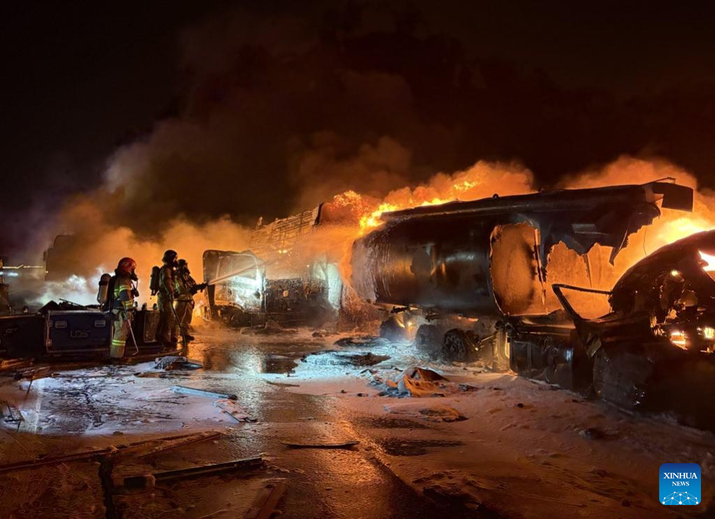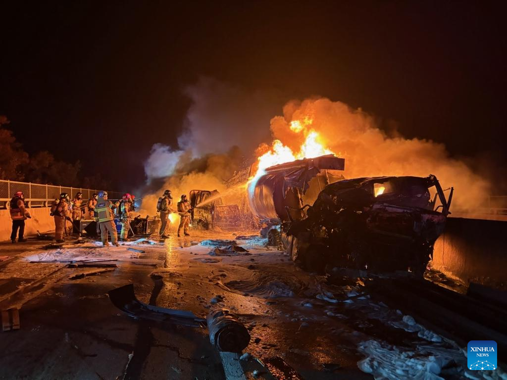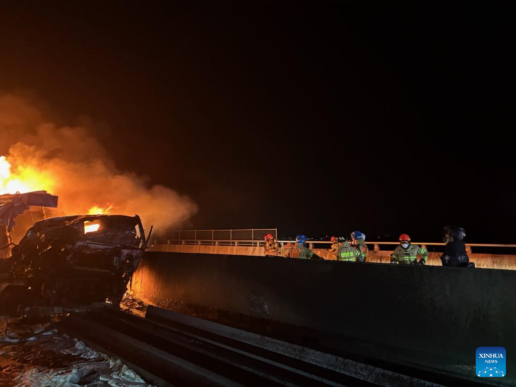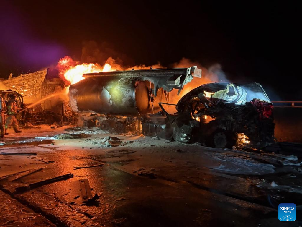 Firefighters try to put out the fire at the site of a chain collision on a highway in North Gyeongsang province, South Korea, on Nov. 17, 2025. Two people were killed and four others were injured early Monday following a chain collision involving 13 vehicles, including a tanker truck, cargo trucks and passenger cars, in South Korea, according to Yonhap news agency. (Xinhua)