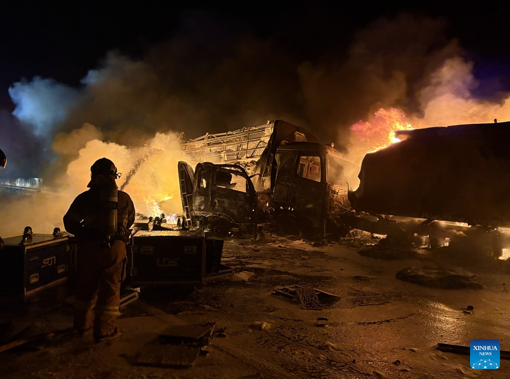 A firefighter tries to put out the fire at the site of a chain collision on a highway in North Gyeongsang province, South Korea, on Nov. 17, 2025. Two people were killed and four others were injured early Monday following a chain collision involving 13 vehicles, including a tanker truck, cargo trucks and passenger cars, in South Korea, according to Yonhap news agency. (Xinhua)