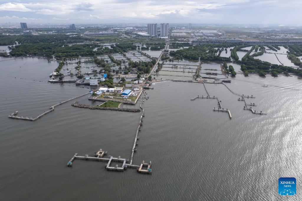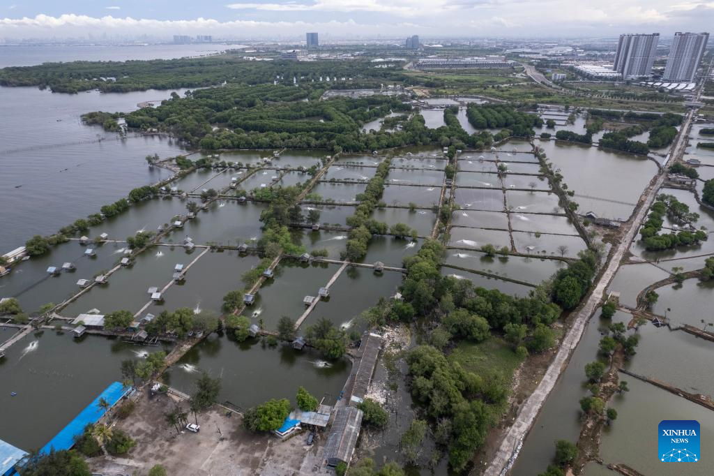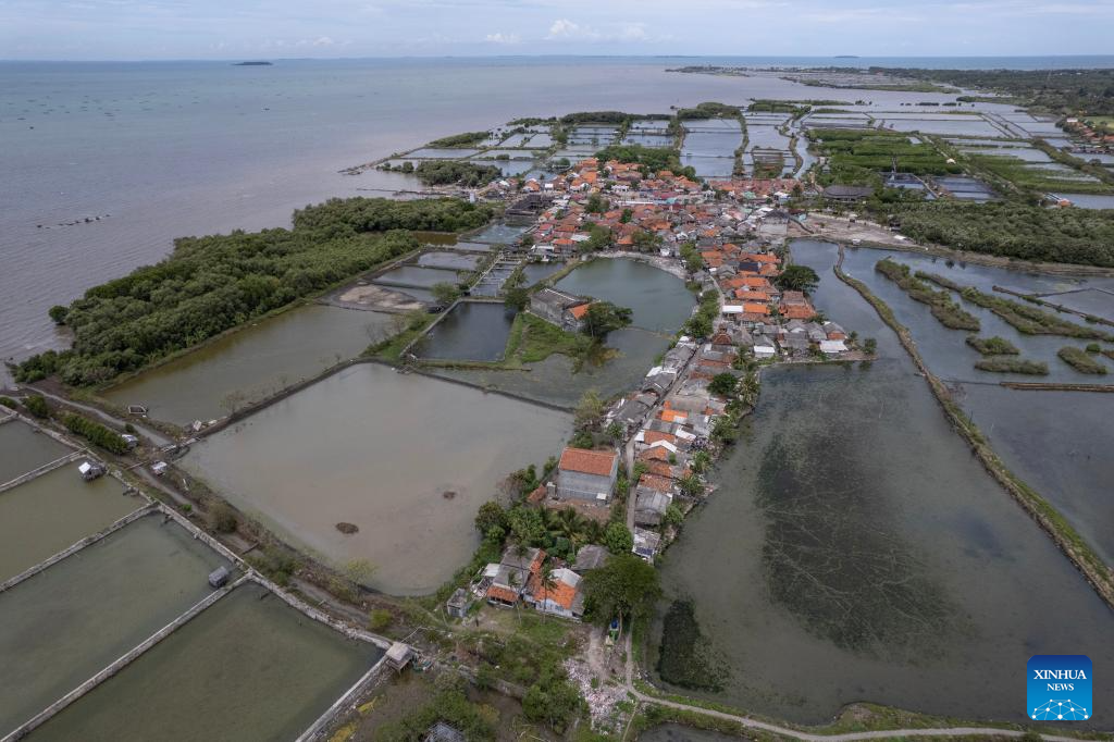 An aerial drone photo taken on Nov. 13, 2025 shows mangrove forests, coastal settlements and fish ponds in the coastal area of Muara Village in Tangerang Regency, Banten Province, Indonesia. (Xinhua/Veri Sanovri)