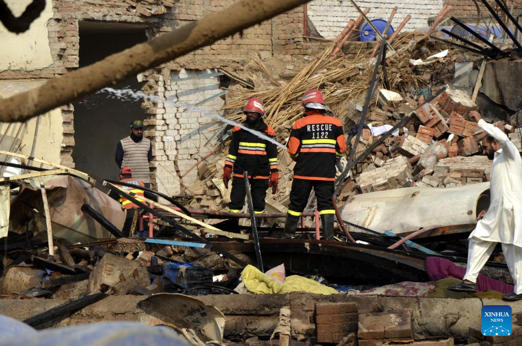 Rescuers work at the explosion site of a chemical factory in Faisalabad, Punjab province, Pakistan, Nov. 21, 2025. Twelve people were killed and scores of others injured on Friday morning when a boiler exploded at a chemical factory in a residential locality in Pakistan's eastern Punjab province, police sources said. The blast happened at about 5:30 a.m. local time (0030 GMT) in the industrial city of Faisalabad, triggering a massive fire that rapidly spread through the facility, police sources told Xinhua. (Xinhua)