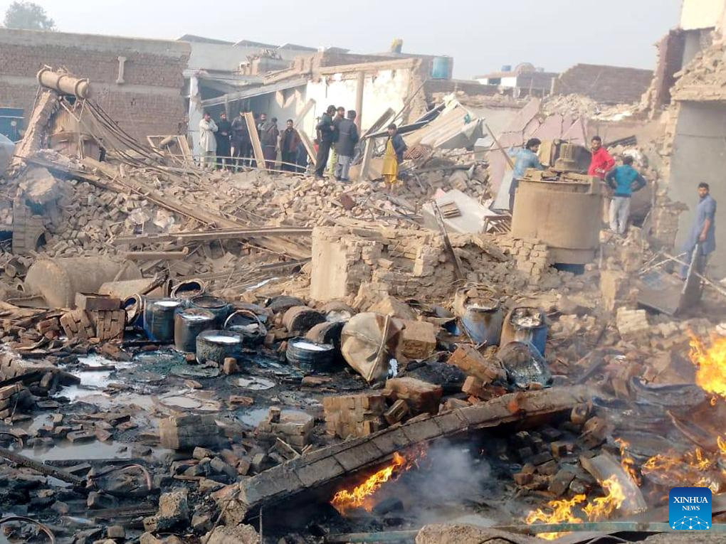 People are seen at the explosion site of a chemical factory in Faisalabad, Punjab province, Pakistan, Nov. 21, 2025. Twelve people were killed and scores of others injured on Friday morning when a boiler exploded at a chemical factory in a residential locality in Pakistan's eastern Punjab province, police sources said.