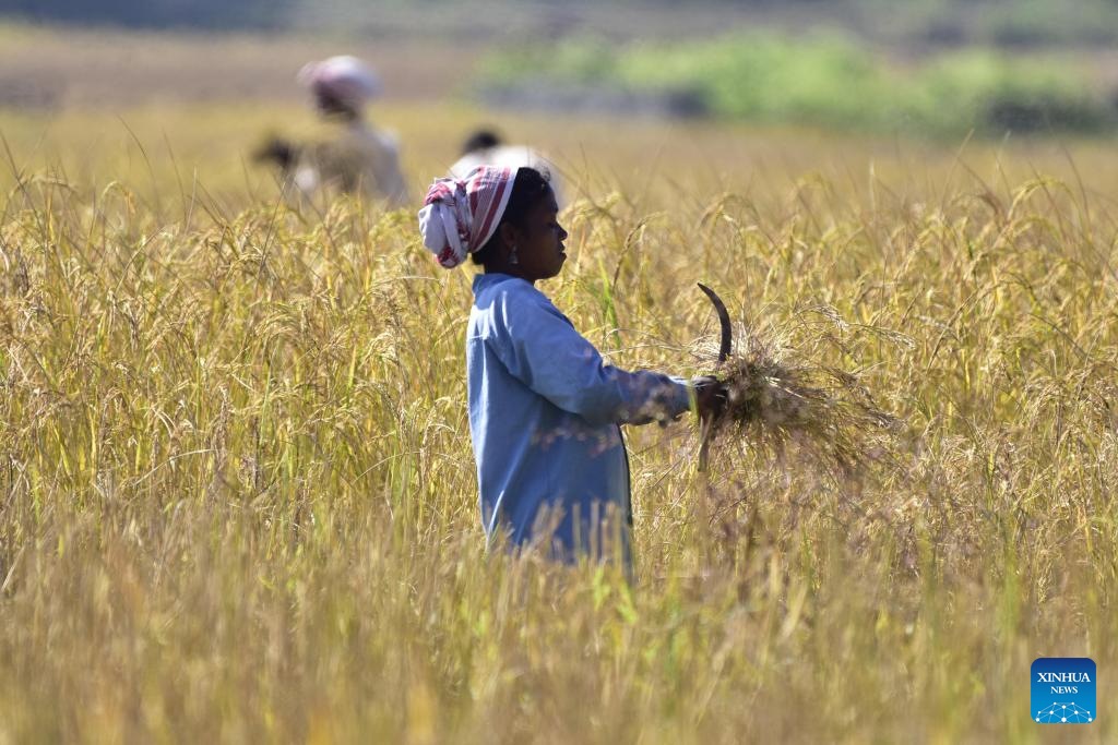 A farmer harvests paddy at a field in Nagaon district of India's northeastern state of Assam, Nov. 20, 2025. (Str/Xinhua)
