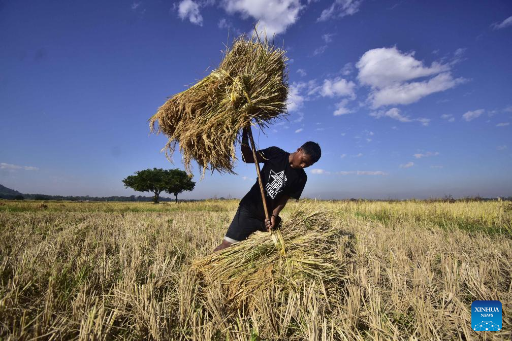 A farmer carries harvested paddy at a field in Nagaon district of India's northeastern state of Assam, Nov. 20, 2025. (Str/Xinhua)