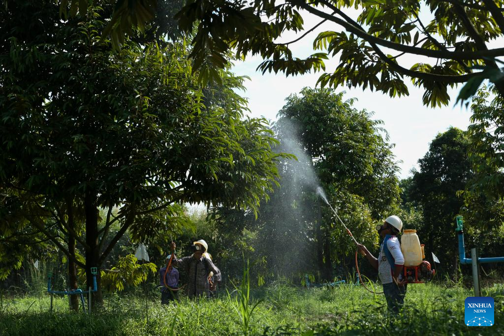 Workers operate at a durian orchard on the outskirts of Yangon, Myanmar, Nov. 15, 2025.(Xinhua/Myo Kyaw Soe)