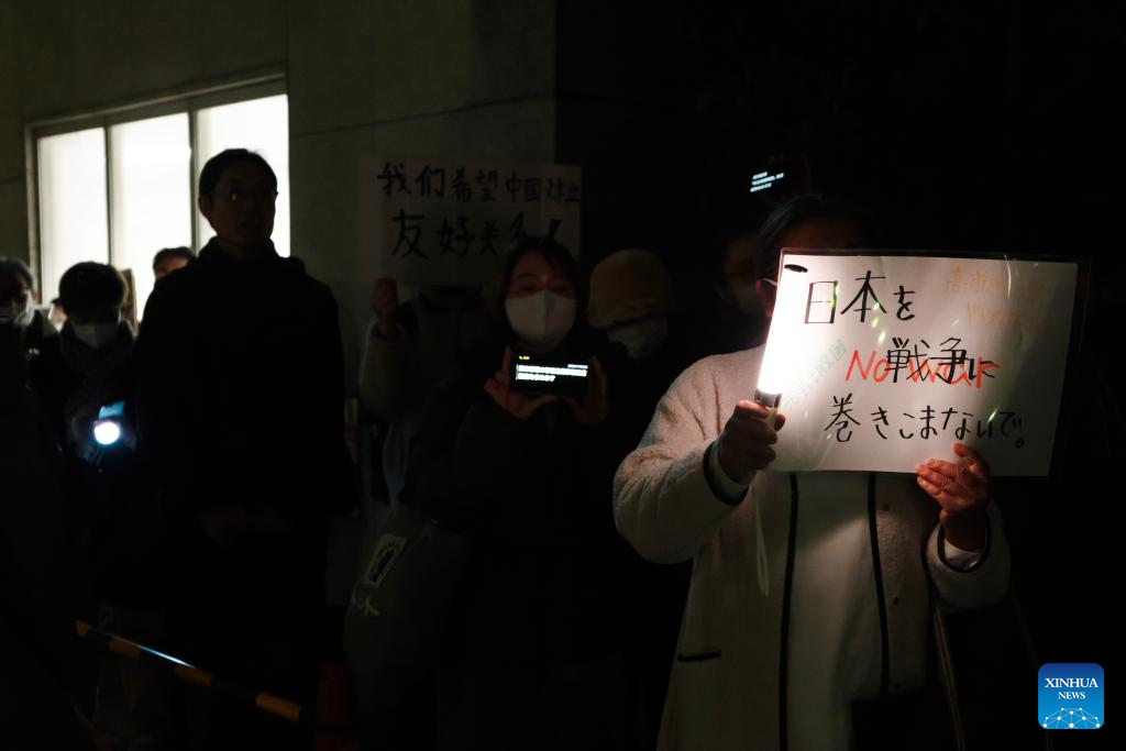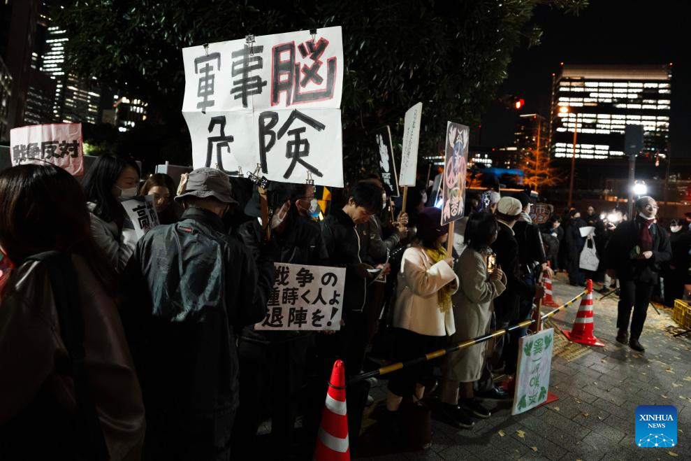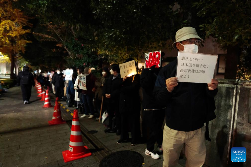 People attend a protest in front of the Japanese prime minister's official residence in Tokyo, Japan, Nov. 28, 2025. In response to Japanese Prime Minister Sanae Takaichi's recent erroneous remarks on China's Taiwan and her continued lack of remorse, Japanese people held another large-scale protest in Tokyo on Friday evening, demanding that Takaichi retract her statements. (Xinhua/Jia Haocheng)