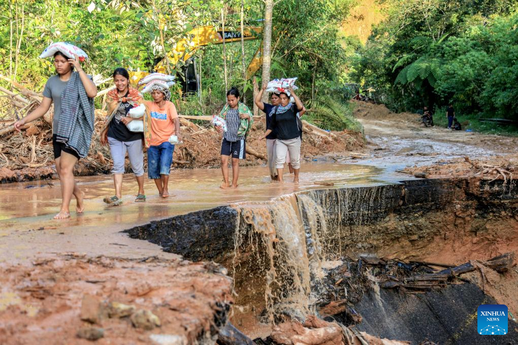 People carry disaster relief supplies at a flood-hit village in North Tapanuli Regency, North Sumatra, Indonesia, Dec. 2, 2025. (Photo by Alberth Damanik/Xinhua)