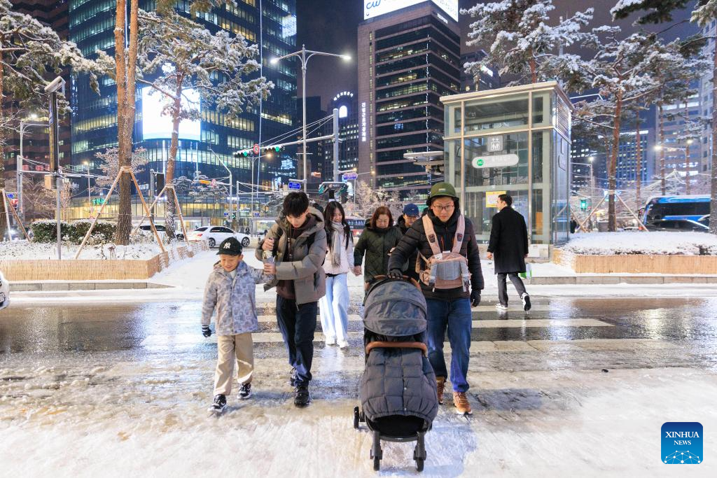People walk in snow in Seoul, South Korea, on Dec. 4, 2025. Seoul on Thursday saw its first snowfall of this year. (Photo by Park Jintaek/Xinhua)