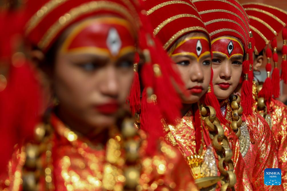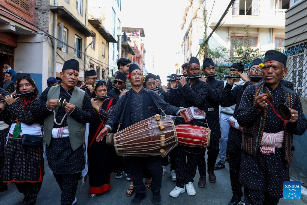 People in traditional attire perform during a rally celebrating Yomari Punhi in Kathmandu, Nepal, on Dec. 4, 2025. Yomari Punhi is a festival especially celebrated by Newar community in Nepal to mark the end of the rice harvest on full moon day. (Photo by Sulav Shrestha/Xinhua)