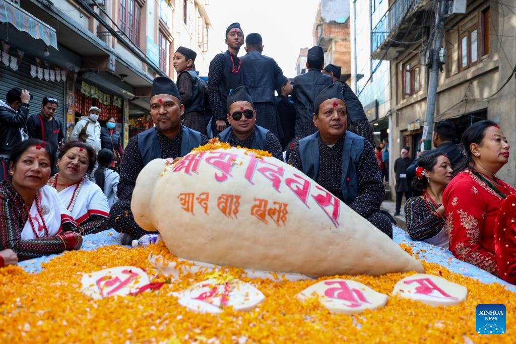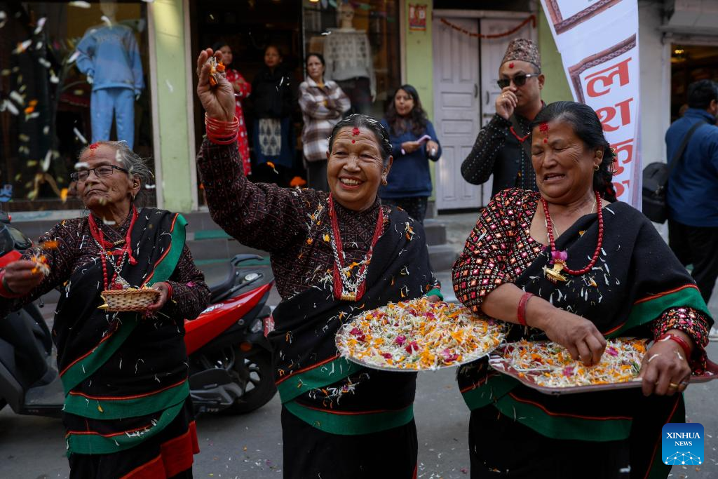 People in traditional attire take part in a rally celebrating Yomari Punhi in Kathmandu, Nepal, on Dec. 4, 2025. Yomari Punhi is a festival especially celebrated by Newar community in Nepal to mark the end of the rice harvest on full moon day. (Photo by Sulav Shrestha/Xinhua)