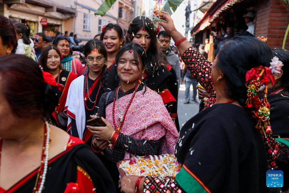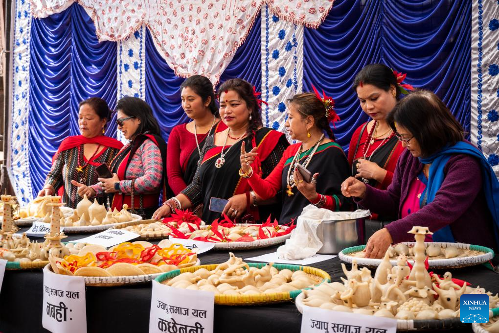 (251204) -- LALITPUR, Dec. 4, 2025 (Xinhua) -- Newari women in traditional attire participate in a Yomari display event to celebrate Yomari Punhi in Lalitpur, Nepal, on Dec. 4, 2025. Yomari Punhi is a festival especially celebrated by Newar community in Nepal to mark the end of the rice harvest on full moon day. (Photo by Hari Maharjan/Xinhua)