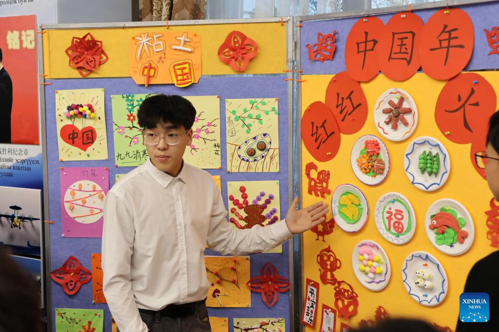 A Mongolian student displays his artwork during an open day event held at the Chinese Embassy in Mongolia, in Ulan Bator, Mongolia, Dec. 5, 2025. The Embassy of China in Mongolia on Friday hosted an open day event, which was attended by more than 200 primary and secondary school teachers, students and parents in Ulan Bator.(Xinhua/Bolortsetseg)