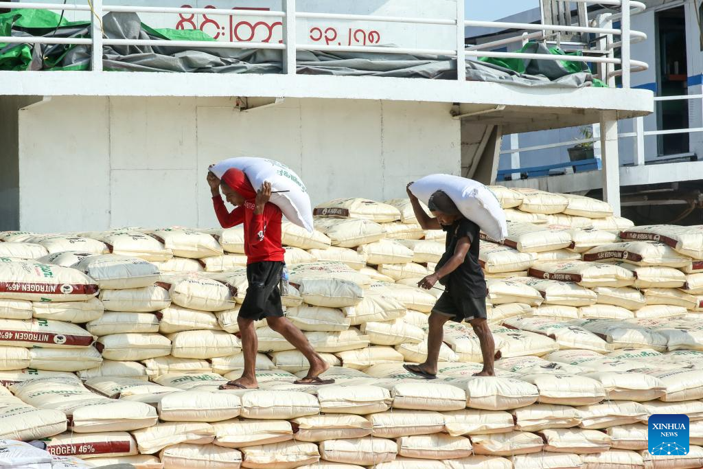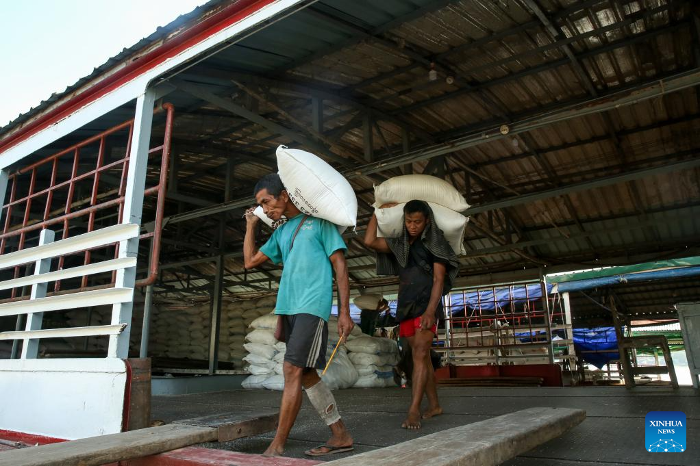 A worker carries a bag of rice at a jetty in Yangon, Myanmar, Dec. 10, 2025. Myanmar exported over 1.78 million tons of rice and broken rice in the first eight months of the current fiscal year 2025-2026, according to the Myanmar Rice Federation on Wednesday. (Xinhua/Myo Kyaw Soe)