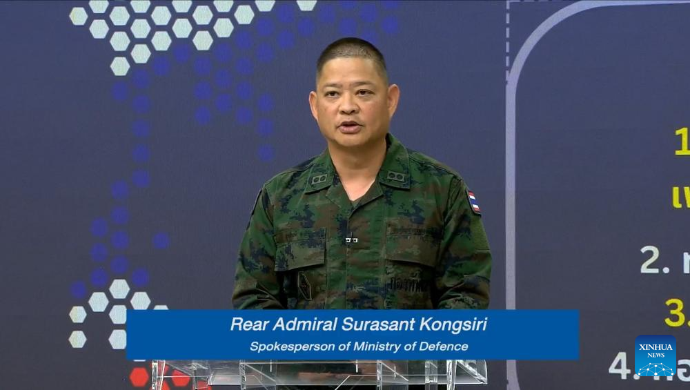 This video screenshot shows Thai Defense Ministry spokesperson Surasant Kongsiri speaking at a press conference in Bangkok, Thailand on Dec. 10, 2025. Thai Defense Ministry spokesperson Surasant Kongsiri said Wednesday that the ongoing border clashes with Cambodia had forced over 400,000 Thai residents across seven provinces to evacuate. Thailand's 2nd Army Area Command stated on social media that, beginning at 5:00 a.m. local time Wednesday, exchanges of fire occurred in multiple areas along the border in Buriram, Surin, Sisaket and Ubon Ratchathani provinces, with no casualties reported so far. The statement added that at around 8:40 a.m. local time, BM-21 rockets fired from the Cambodian side landed near a hospital in Surin province, prompting the evacuation of patients and staff to shelters. (Xinhua)