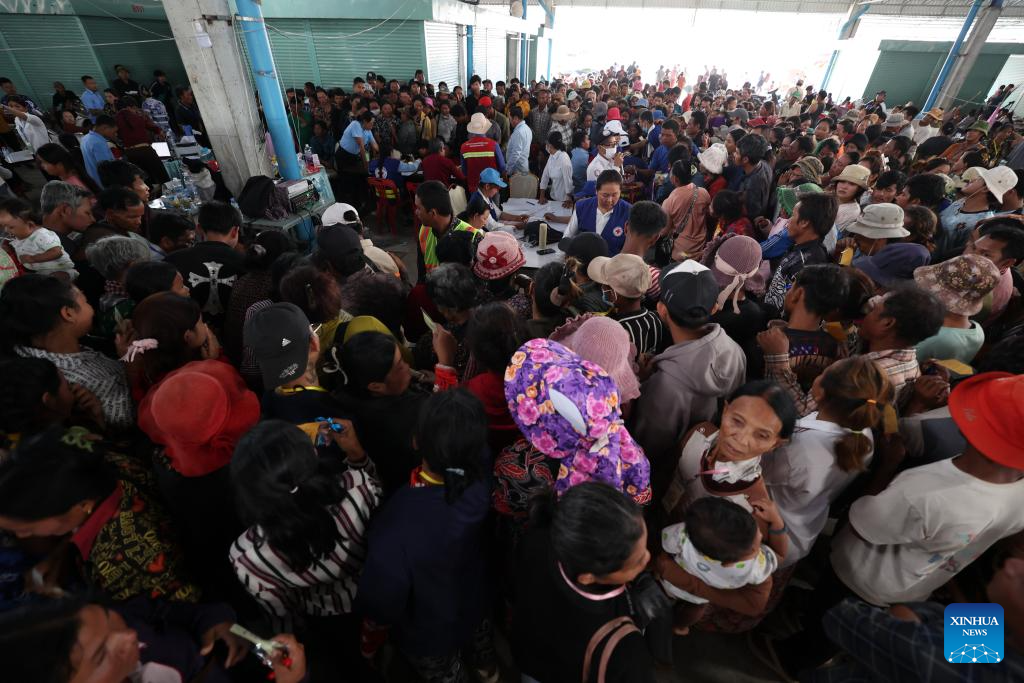 Cambodian evacuees queue to register for relief items at a safe zone in Banteay Meanchey province, Cambodia on Dec. 12, 2025. The number of Cambodian evacuees from the ongoing border fighting with Thailand has risen to more than 300,000 as of Friday afternoon, the Cambodian Ministry of Interior said in a press release. (Photo by Sovannara/Xinhua)