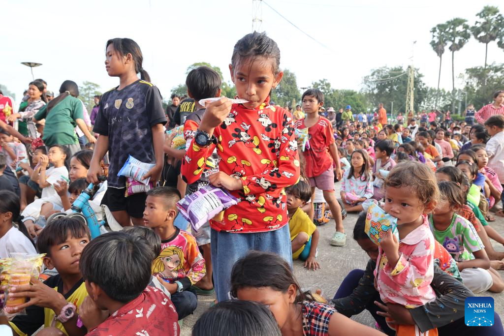 Cambodian children gather for snacks donated by charitable persons at a safe zone in Banteay Meanchey province, Cambodia on Dec. 12, 2025. The number of Cambodian evacuees from the ongoing border fighting with Thailand has risen to more than 300,000 as of Friday afternoon, the Cambodian Ministry of Interior said in a press release. (Photo by Sovannara/Xinhua)