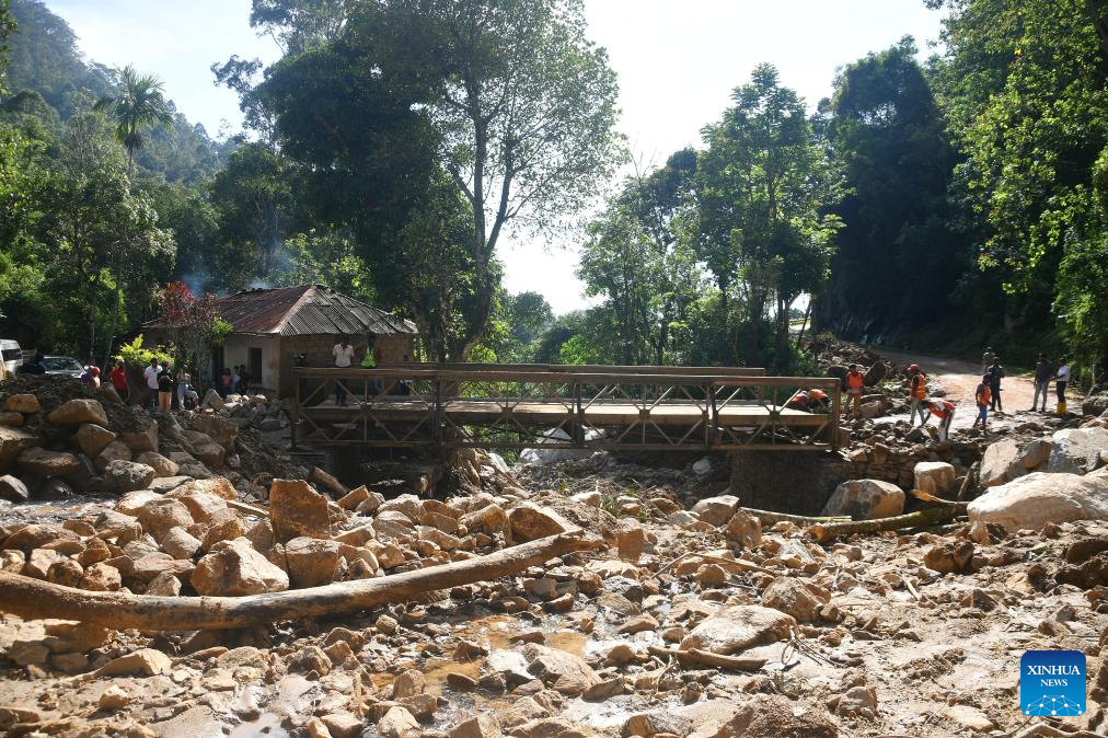 People repair a collapsed bridge affected by Cyclone Ditwah in Badulla District, Sri Lanka, Dec. 13, 2025. According to Sri Lanka's Disaster Management Center, the country recently suffered severe damage due to the extreme weather triggered by Cyclone Ditwah, which left more than 600 people dead, affected more than 2 million people, destroyed more than 4,000 houses and partially damaged more than 60,000 houses nationwide. (Photo by Ajith Perera/Xinhua)