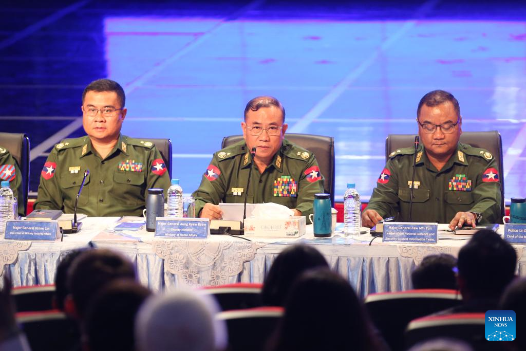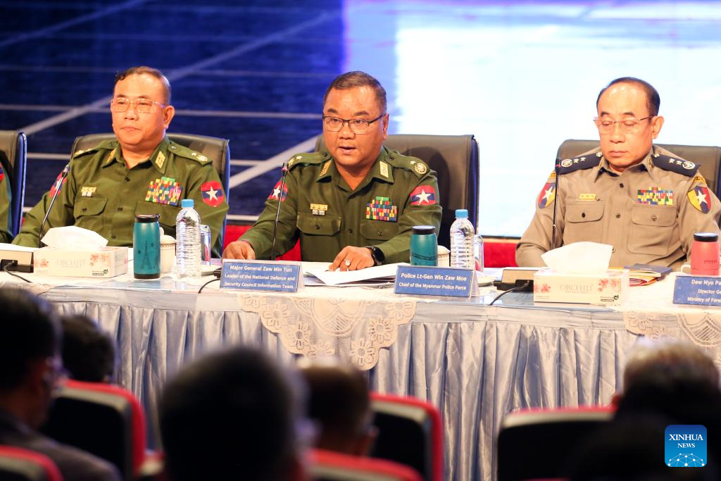 Myanmar's Deputy Minister for Home Affairs Maj-Gen Aung Kyaw Kyaw (C) speaks at a press conference on the elimination of telecom fraud and online gambling in Yangon, Myanmar, Dec. 14, 2025. (Xinhua/Myo Kyaw Soe)
