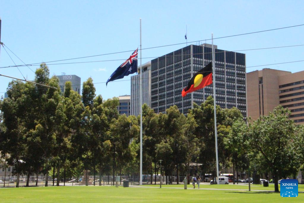 (251215) -- PERTH, Dec. 15, 2025 (Xinhua) -- Australian national flag flies at half-mast at Kings Park in Perth, Australia, Dec. 15, 2025.