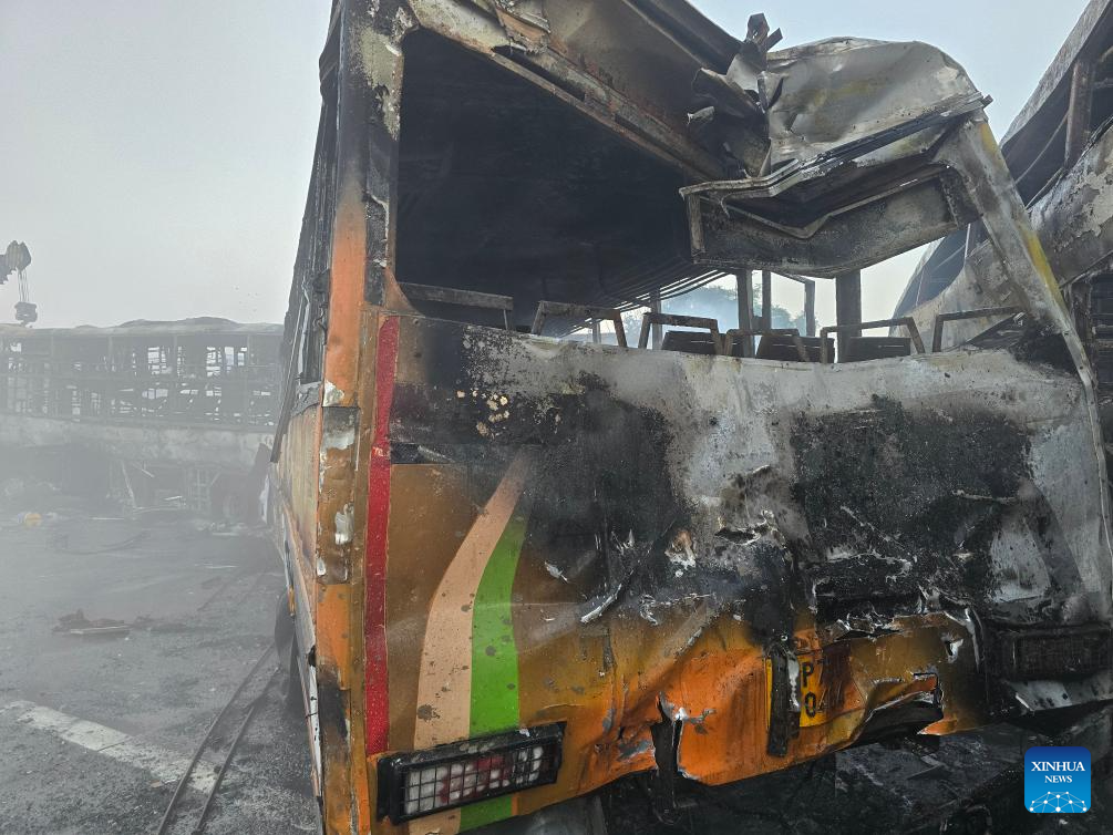 Wreckage of buses are seen after a multi-vehicle collision on the Delhi-Agra Expressway in Mathura district of India's northern state of Uttar Pradesh, Dec. 16, 2025. The death toll from Tuesday's multi-vehicle collision has risen to 15, with around 48 people injured, local police confirmed by phone. Up to seven buses and three cars were involved in the pileup amid heavy fog. The collision immediately caused the vehicles to catch fire, resulting in numerous casualties. (Str/Xinhua)