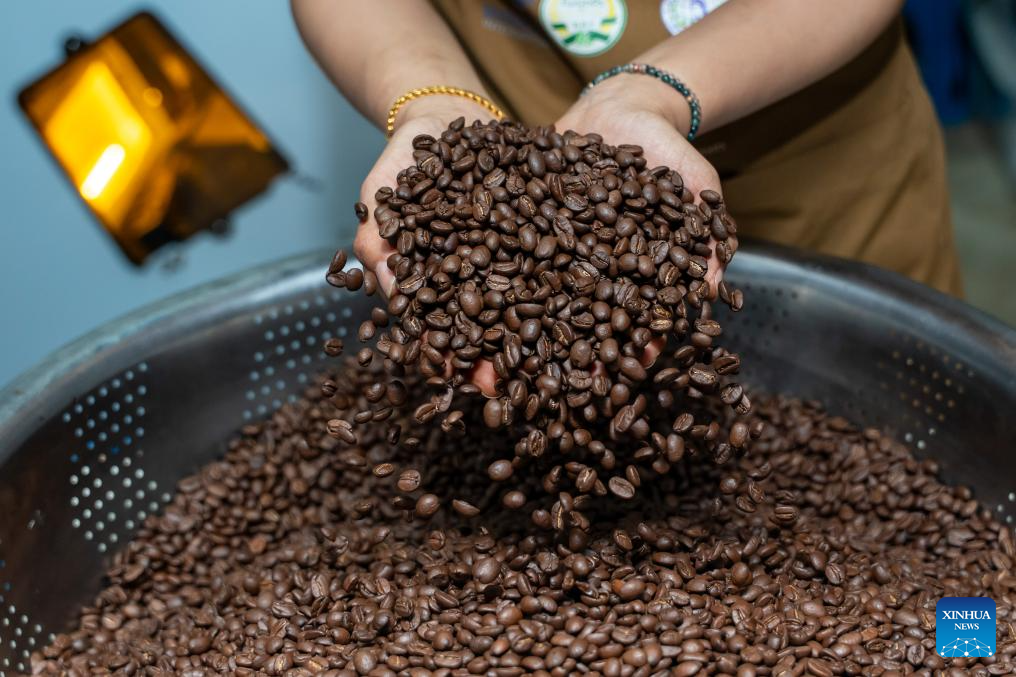 A coffee roaster presents freshly roasted coffee beans at a coffee plantation in Champasak Province, Laos, Dec. 17, 2025. Laos is currently in the coffee bean harvest season, and farmers are seizing the sunny weather to pick and process coffee beans. (Photo by Kaikeo Saiyasane/Xinhua)