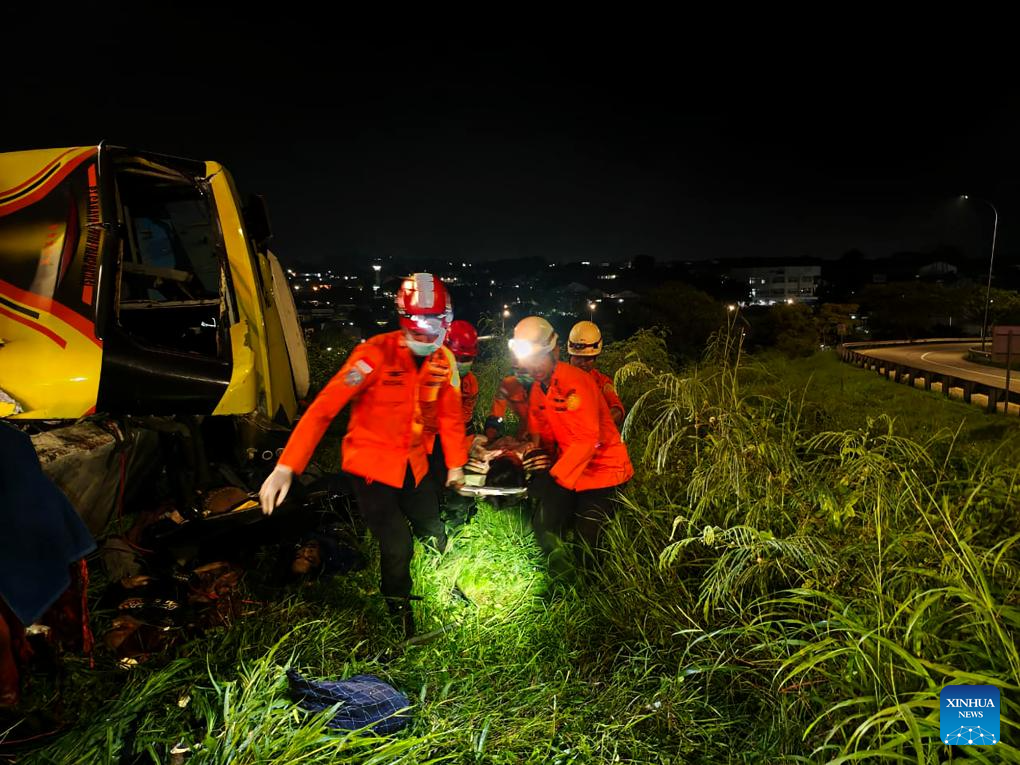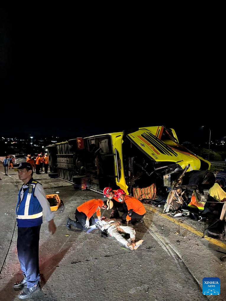 At least 15 people were killed and 19 others injured after a long-distance bus crashed at a toll road exit in Semarang, Central Java, Indonesia, early Monday, the local search and rescue authority said. (Basarnas Semarang/Handout via Xinhua)