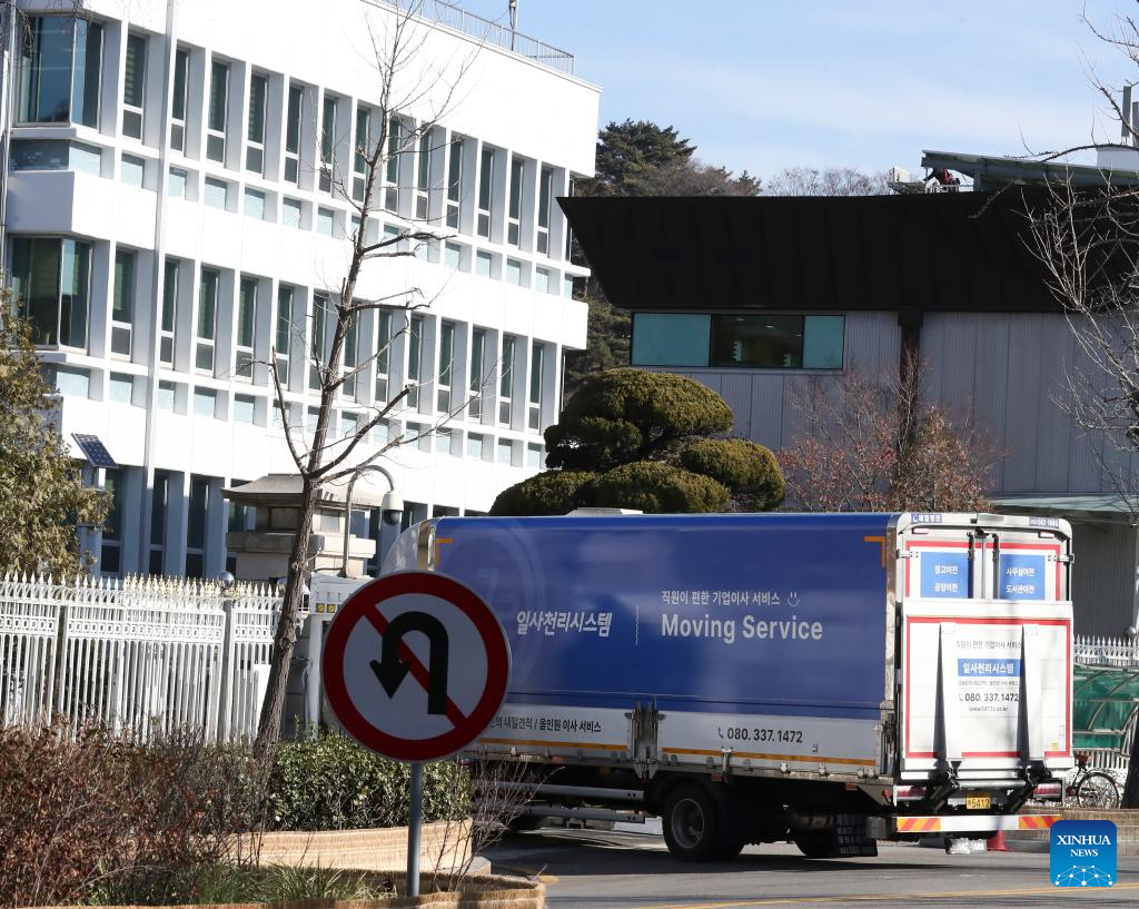 Staff members transport office supplies out of the presidential office in Yongsan, Seoul, South Korea, on Dec. 22, 2025. South Korea's presidential office will officially return to Cheong Wa Dae, which is widely known as the Blue House, at midnight on Dec. 29, Yonhap News Agency reported on Wednesday. (Xinhua/Yao Qilin)