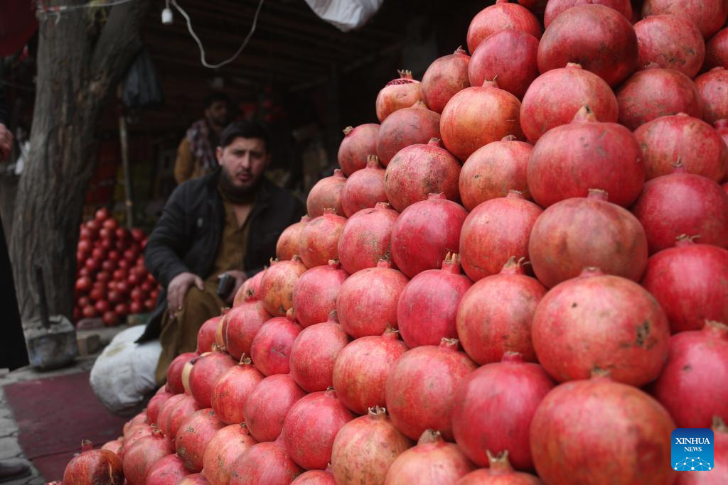 Pomegranates for sale are pictured in Kabul, Afghanistan, on Dec. 28, 2025. Afghanistan has exported pomegranates from Kandahar province to Qatar for the first time, as a significant step in efforts to expand the country's agricultural products to new international markets, local media Tolo news reported Saturday. (Photo by Saifurahman Safi/Xinhua)