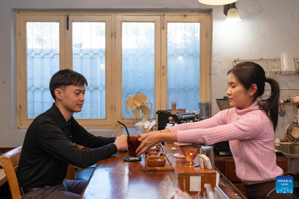 A customer (L) enjoys coffee at a coffee shop in Vientiane, Laos, Dec. 22, 2025. (Photo by Ma Huaizhao/Xinhua)