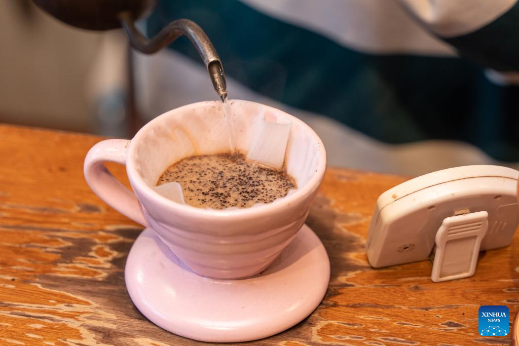 A barista brews coffee at a coffee shop in Champasak Province, Laos, Dec. 17, 2025. (Photo by Ma Huaizhao/Xinhua)
