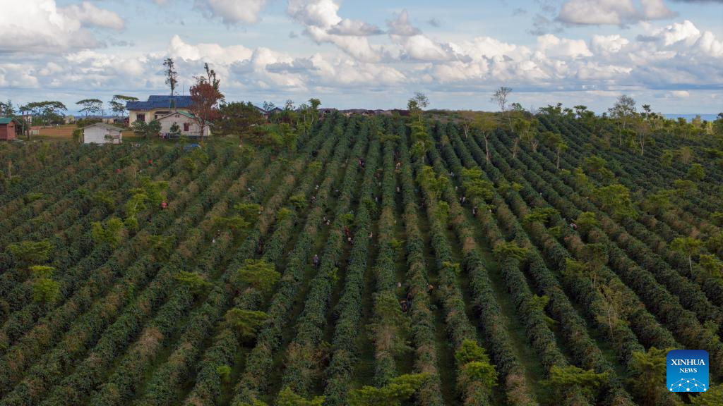 This aerial drone photo shows farmers harvesting coffee beans at a coffee plantation in Champasak Province, Laos, Dec. 17, 2025. (Photo by Kaikeo Saiyasane/Xinhua)