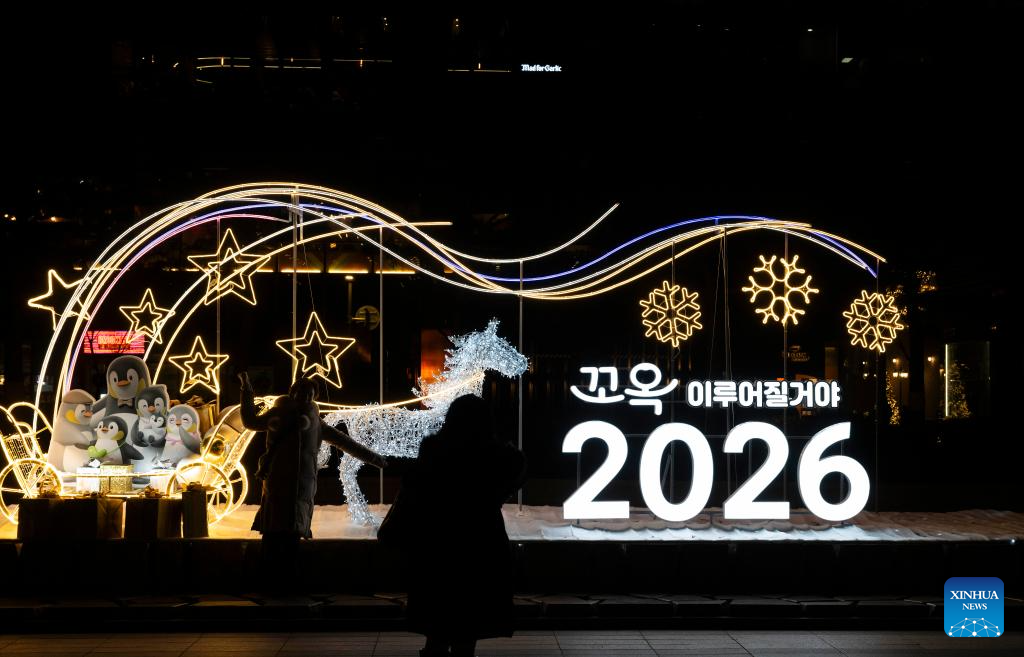 People pose for a photo in front of a New Year light display in Seoul, South Korea on Dec. 31, 2025. (Photo by Jun Hyosang/Xinhua)