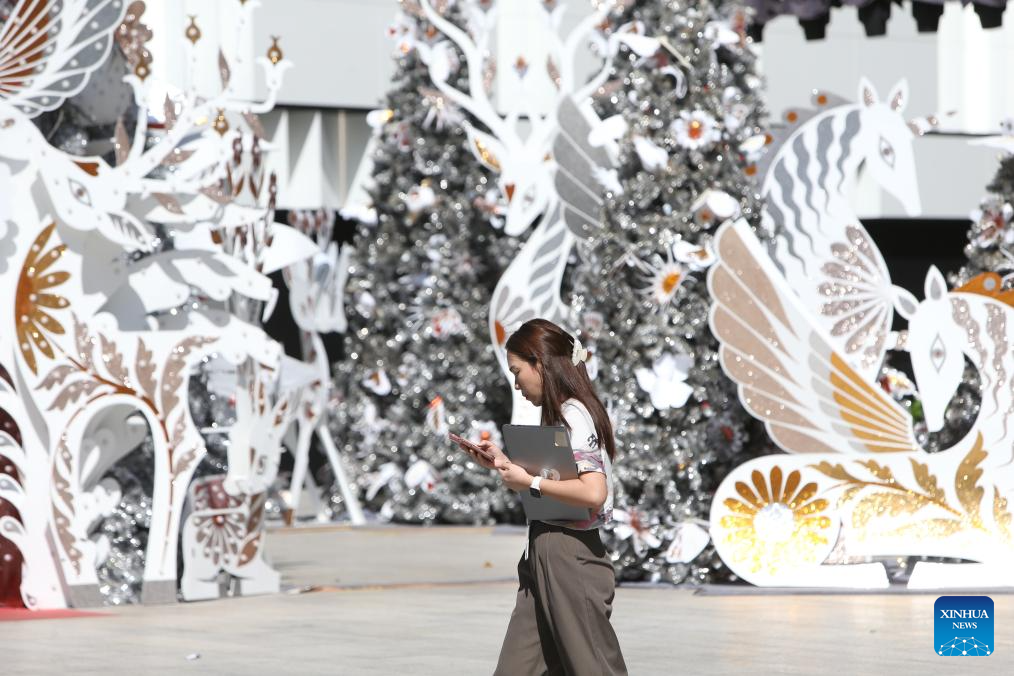 A woman walks past festive decorations at a shopping mall in Bangkok, Thailand, Jan. 6, 2026. Thailand's business sentiment weakened in December 2025 as confidence in the manufacturing sector faded amid continued improvements in the non-manufacturing sector, data from the central bank showed on Monday. (Xinhua/Rachen Sageamsak)
