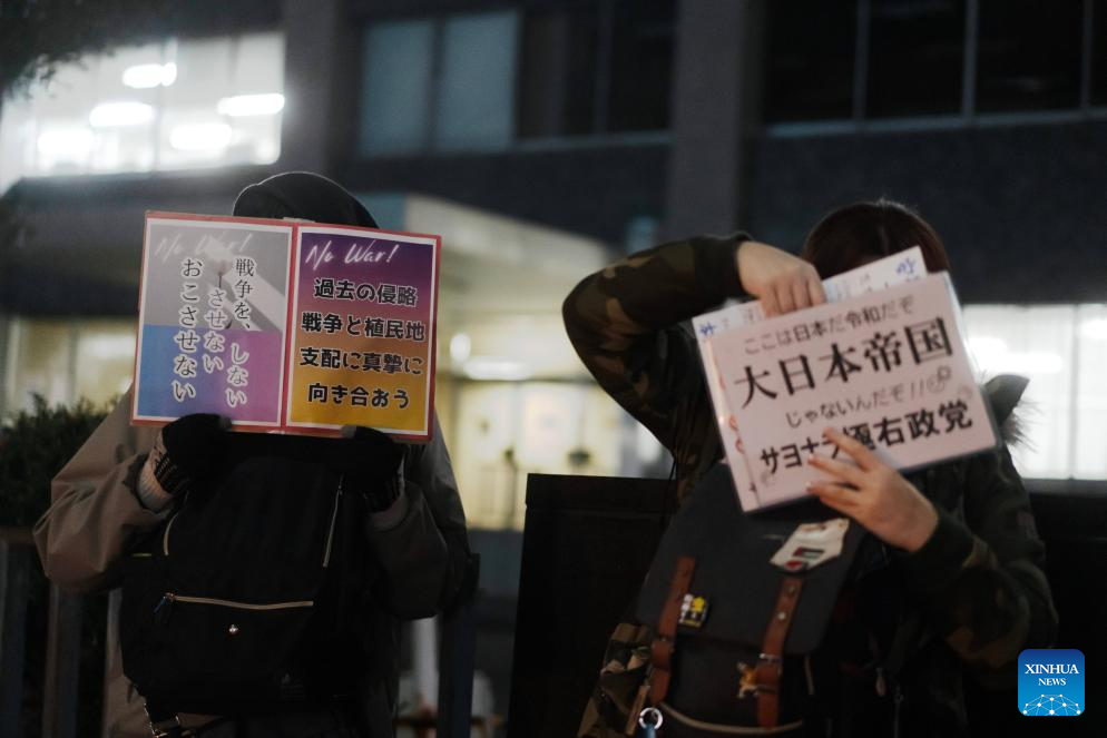TOKYO, Jan. 10 (Xinhua) -- Large numbers of Japanese residents rallied in Tokyo on Friday evening to protest Prime Minister Sanae Takaichi's evasive stance on U.S. military strikes against Venezuela, as well as a series of dangerous recent military policy moves by her administration.