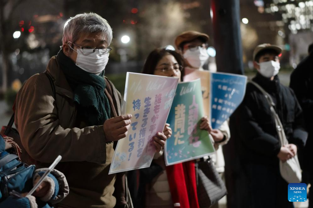 The protest, jointly organized by multiple civic groups, began at 7 p.m. local time in front of the prime minister's official residence, with demonstrators holding signs to express their demands, including "Force cannot create peace," "We need politics that uphold the constitution," and "No war anywhere on earth."