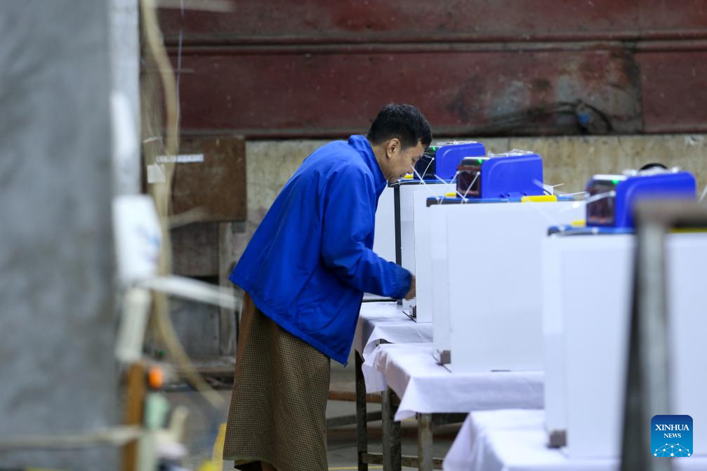 A man votes at a polling station during the second phase of the general election in Yangon, Myanmar, Jan. 11, 2026. Myanmar kicked off the second phase of its multi-party democratic general election on Sunday morning, with polling stations opening across 100 townships. (Xinhua/Myo Kyaw Soe)