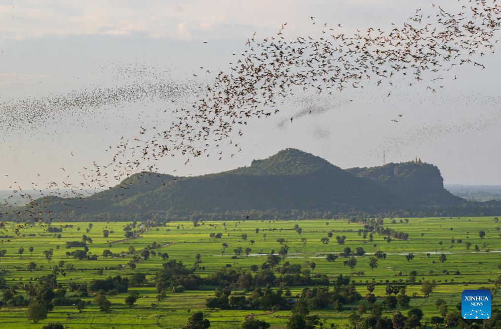 This photo taken on Aug. 13, 2025 shows a view of the Phnom Sampov, a limestone mountain and religious site, in Battambang province, Cambodia. Cambodia's Ministry of Environment, in collaboration with Fauna & Flora-Cambodia Program, on Monday released guidelines for sustainable development and management of caves, the first of their kind for the country. The guidelines mark a significant step towards the protection and sustainable management of Cambodia's unique limestone karst ecosystems, said a joint press release. (Fauna & Flora-Cambodia Program/Handout via Xinhua)