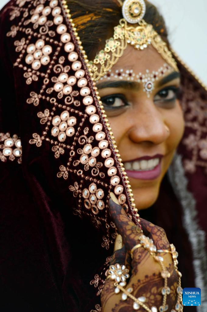 A bride poses for a photo during a mass wedding ceremony in Karachi, Pakistan, Jan. 11, 2026. (Str/Xinhua)
